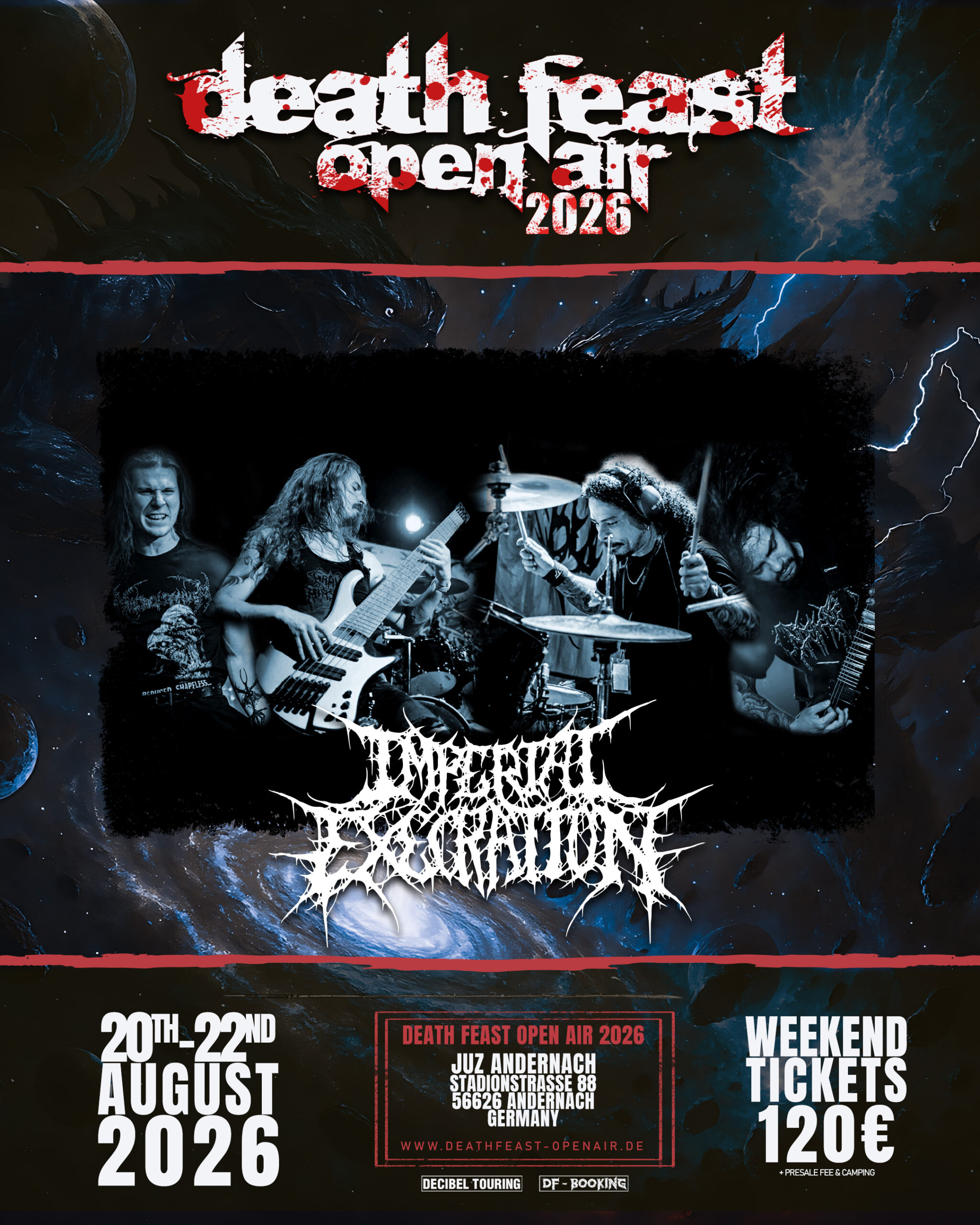 More Brutal Death Metal with apocalyptic weight is coming to DEATHFEAST OPEN AIR 2026 - OFFICIAL EVENT. Formed in 2019, this band delivers crushing riffs, merciless blast beats, and punishing gutturals into a sound that feels like total annihilation on tape and live. This is the kind of extreme music that’ll tear the pit apart from the first riff. Welcome Imperial Execration from Czech Republic Next band coming tomorrow. Get your tickets in the meantime.