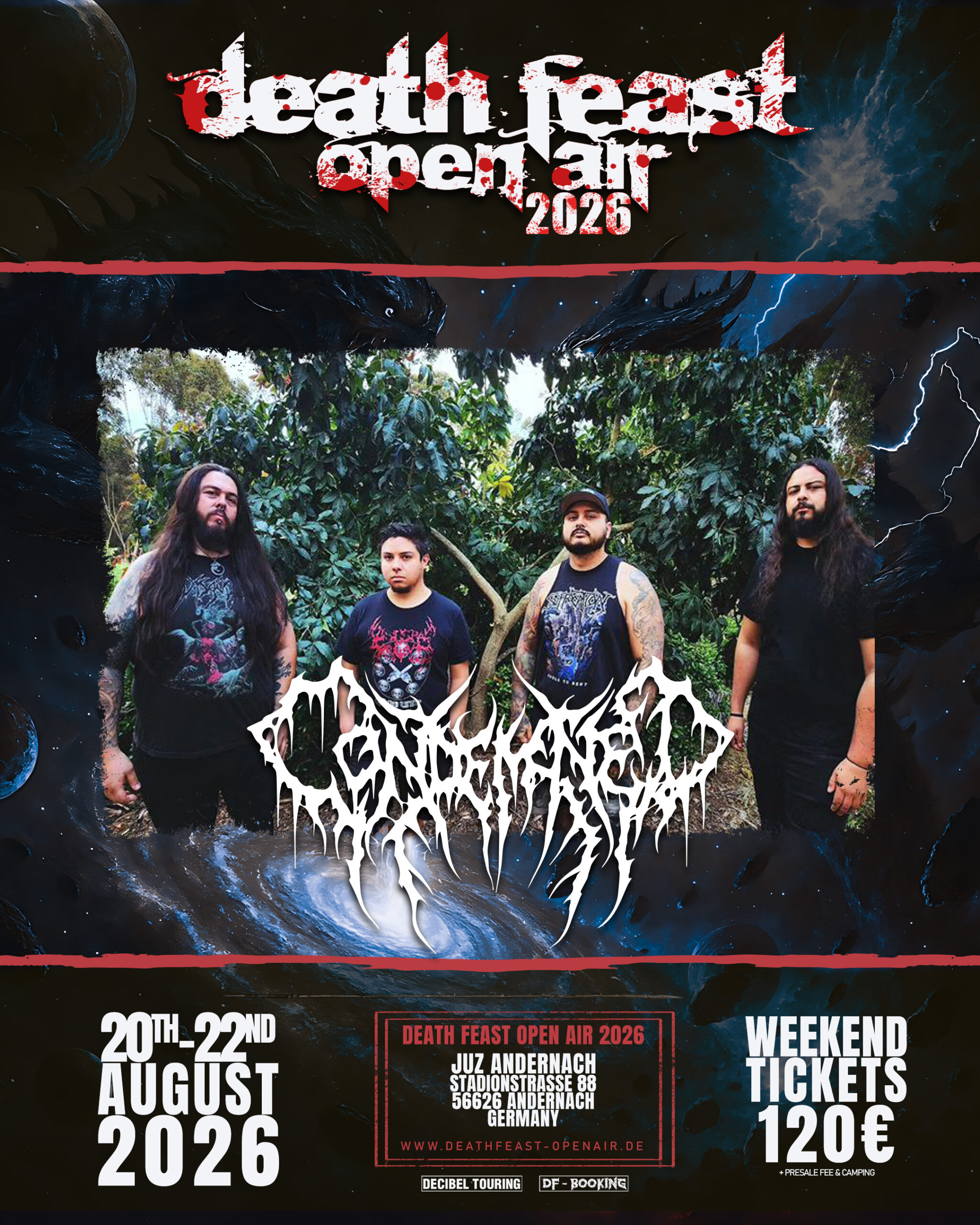 One announcement to go after this. But first we have to blow off the Brutal Death Metal Machine Gun. San Diego Brutality is coming to DEATHFEAST OPEN AIR 2026 and it will get heavy! Since 2004, these guys have been one of the defining names in West Coast Brutal Death Metal. Low-tuned guitars, merciless blast beats, gutturals from the depths theyy have been delivering the goods for over two decades and their latest record "Daemonium" proves they haven't lost a single gram of heaviness. Welcome CONDEMNED from the USA! One final announcement left. Can you guess who it will be?